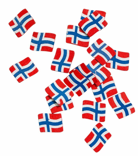Dekorativ bordpynt i form av norske flagg i tre – passer perfekt til 17. mai feiringen. Innhold: 20 stk., mål: 2 x 1,5 cm.
