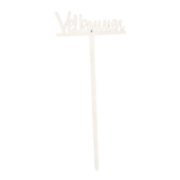 Fint, hvitt treskilt med teksten Velkommen. Dekorasjonspinnen er perfekt å stikke ned i blomsterpotten. Høyde 35 cm.