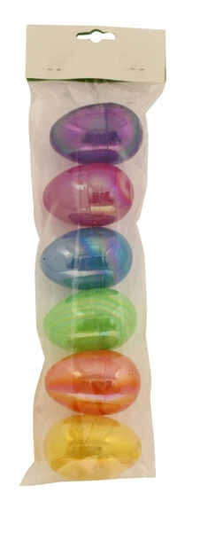 Festilge, regnubuefargede plastegg i ulike farger som passer til påskens store jakt på egg. Lengde: 8 cm. Selges i 6-pack. Kompletter med skilt og eggkurv til påskeleken. Selges separat.