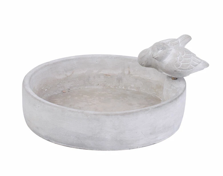 Vakkert fuglebad i sement, formet i en fin, rund form, dekorert med en skulpturert fugl. Fuglebadet er flott å pynte hagen med, samtidig som fuglene får et sted de kan bruke. Legg gjerne noen fine steiner på bunnen, slik at både fugler og insekter har noe å lande på når de skal drikke vann. Husk å plassere fuglebadet slik at ikke katter eller andre rovdyr kan gjemme seg i nærheten. Brukes utendørs fra vår til høst, men oppbevares innendørs om vinteren.