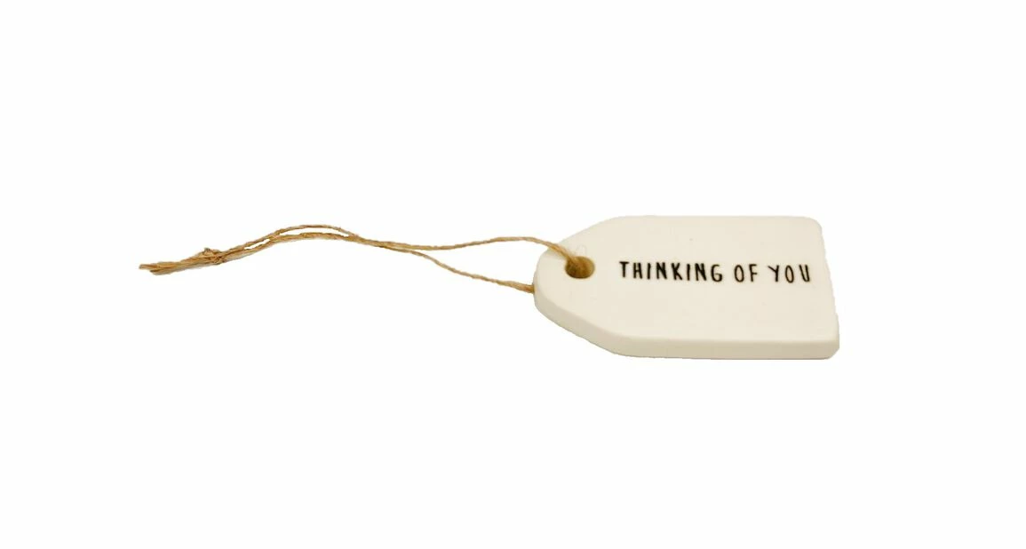 Moderne og bærekraftig alternativ til engangs-gavelapper. Fin gavelapp av keramikk med trykket «Thinking of you» og jutetråd til å feste lappen med. Dekorer gaven din med en etikett av keramikk som kan brukes om igjen og gis videre av mottakeren. Mål: Lengde 5,5 x bredde 3 cm.