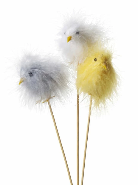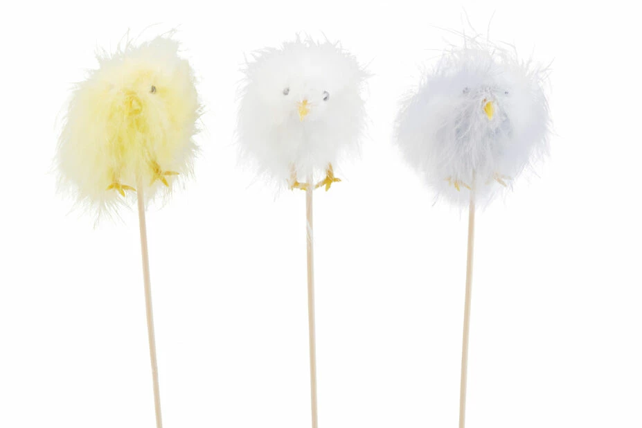 Søte påskekyllinger på pinne, i tre og polyester. Finnes i forskjellige farger.