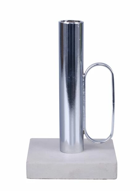 Stilig lysestake med grå sementfot og sølvfarget metallholder. Håndlaget. 15 cm høy. Kombiner med Hilda lysestake 11 cm.