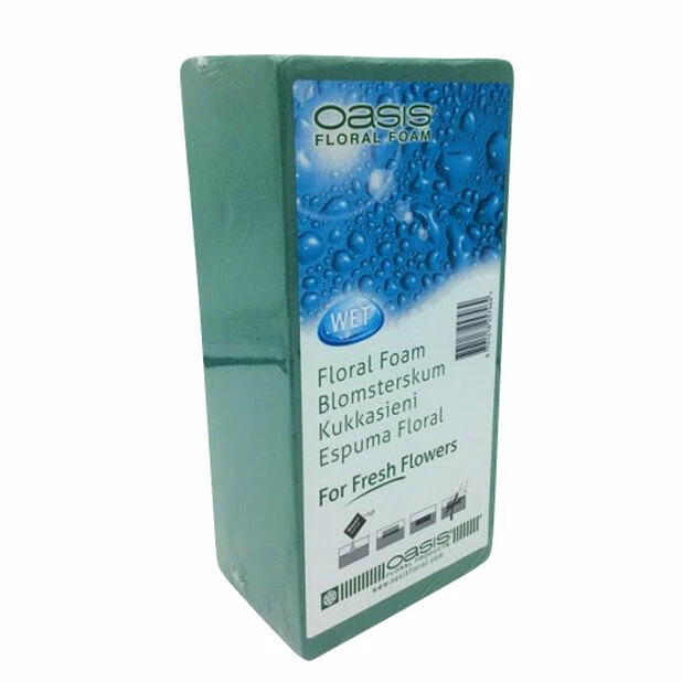 Blokk av våt oasis, perfekt til blomsterdekorering. Blokken er lett å skjære i for å få den til ønsket fasong og størrelse.