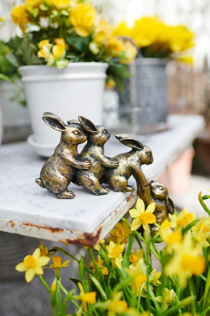 Dekorativ, kobberfarget hagedekorasjon i form av fire søte kaniner som hjelper hverandre. Plasser den på en stein i hagen, på terrassen eller innendørs for å skape påskestemning.