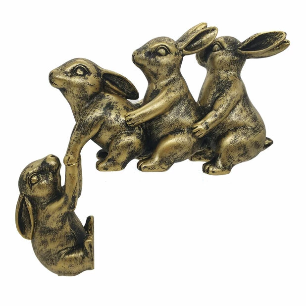 Pynt hjemmet til årets mest fargeglade høytid med påskepynt i form av harer, kaniner, kyllinger og fjær! Denne søte hagedekorasjonen i tradisjonell design forestiller en gruppe kaniner, der tre kaniner hjelper til med å dra opp den fjerde kaninen. Dekorasjonen kan med fordel plasseres på en hyllekant, et rekkverk eller en stein, slik at det ser ut som om den lille kaninen trenger hjelp til å komme opp. Herlig påskepynt for store og små som passer like godt inne som ute. Hagedekorasjonen er laget av polyresin som er forgylt med en matt kobberfarge.