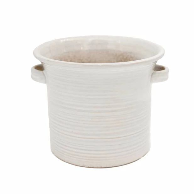 Moderne, hvitglasert potte med håndtak og dreiestriper for en rustikk følelse. Kompletter plantene dine med en stilren potte som matcher din personlige stil!