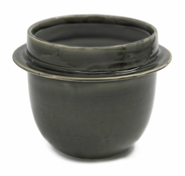 Moderne, glasert, grå keramikkpotte med dekorativ kant øverst. Mål: Ø15,5 cm, høyde: 12 cm. Beregnet til innendørsbruk. Finnes i to ulike størrelser.