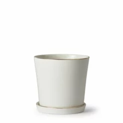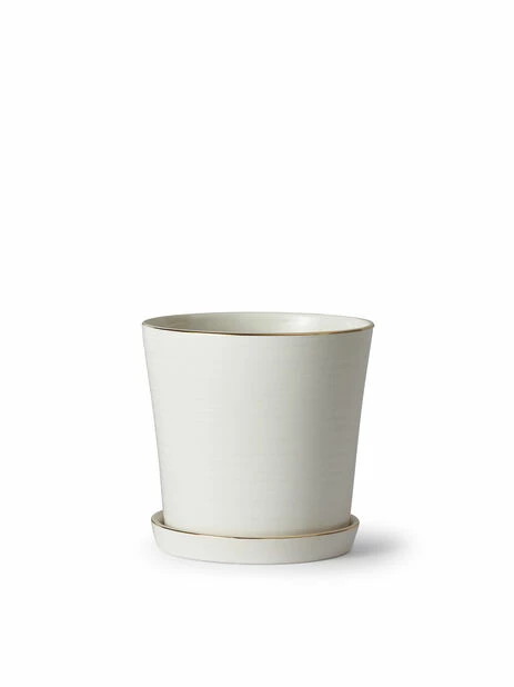 Potten Engla er vakkert og diskré dekorert potte med en smal gullkant på potte og fat. Denne potten er lettplassert og passer fint i de fleste hjem. Skap enda mer liv i hjemmet ditt med vakre blomster i fine potter. Med potter i ulike former, farger og materiale, kan du enkelt fyllet opp hjemmet med herlige planter i din helt egen stil. Små potter, store potter, leirpotter og glasspotter – finn din favoritt og forny innredningen akkurat slik du selv ønsker. Pynt opp med planter på badet eller fresh opp stuen med nye flotte planter. La deg inspirere av vakre blomster i fine potter!