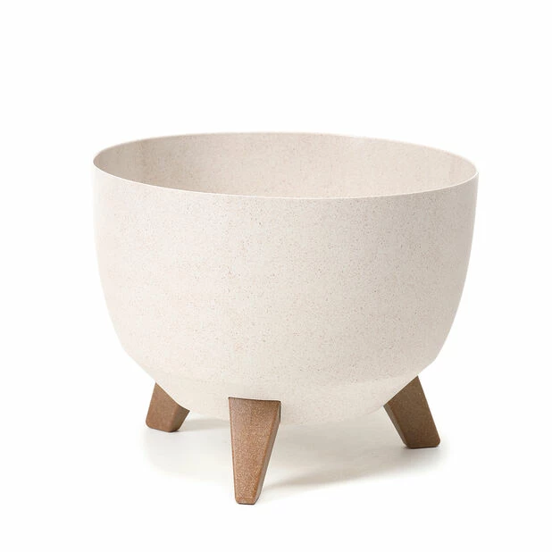 Moderne og lettplassert potte i plast med dekorative trebein og selvvanningsinnsats. Laget av resirkulert plast og rester av treflis fra tre- og møbelproduksjon. Mål: Ø33 cm, høyde: 18,5 cm.
