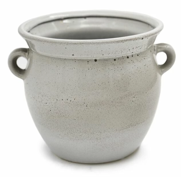 Klassisk potte i blankglasert keramikk med dekorative håndtak på sidene. Beregnet til innendørsbruk. Mål: Ø21 cm, høyde: 16 cm.