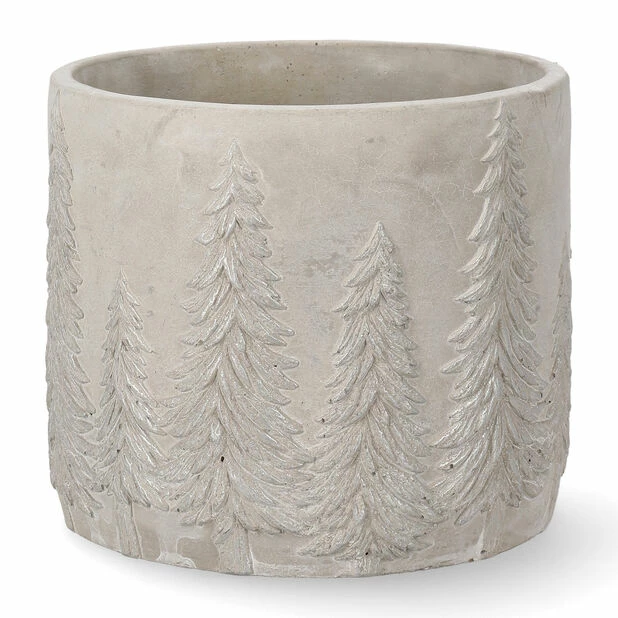 Dekorativ potte i grå keramikk med mønster av grantrær rundt. Perfekt til julens og vinterens blomster og dekorasjoner. Beregnet til innendørsbruk. Mål: Ø17,5 cm, høyde: 15 cm.