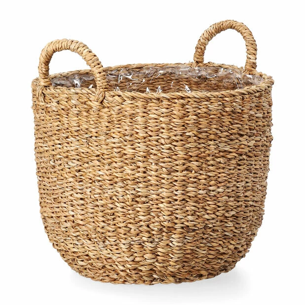 Klassisk, høy flettet kurv i rotting. Flott som både potteskjuler og til oppbevaring. Beregnet til innendørsbruk. Potten har en tynn plastinnsats, men den bør kombineres med en tett innerpotte, et potteunderlag eller vanntett fat som beskytter mot fukt på underlag. Mål: Ø32 cm, høyde: 27 cm.