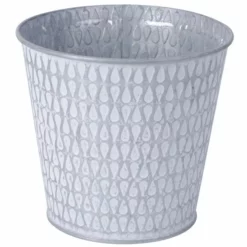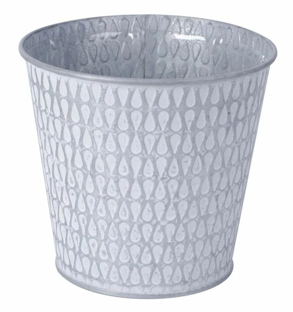 Tradisjonell potte i sink med mønster i relieff. Plastinnsats gjør potten vanntetthet. For innendørsbruk. Finnes i tre ulike farger med diameter Ø12,3 cm og Ø14 cm.