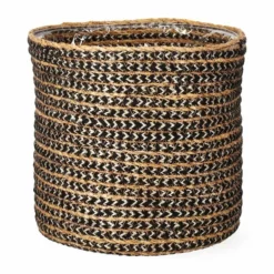 Stilig flettet kurv som forener det klassiske med det moderne. Perfekt som både potteskjuler og til oppbevaring. Beregnet til innendørsbruk. Potten har en tynn plastinnsats, men den bør kombineres med en tett innerpotte, et potteunderlag eller vanntett fat som beskytter mot fukt på underlag. Mål: Ø16 cm, høyde: 16 cm.