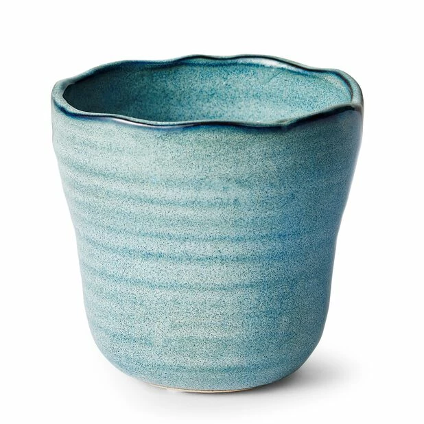 Håndlaget potte i keramikk i en herlig, blå farge og en bølget form. Den vakre glaseringen gjør at potten glinser fint og er helt vanntett. Diameter 11,5 cm, høyde 11 cm. Passer til innerpotter med diameter på 9 cm.
