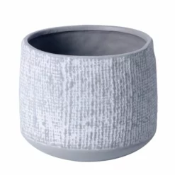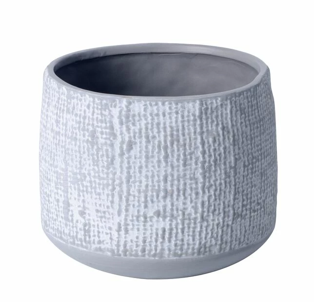Håndlaget potte i grå keramikk i retrostil. Vakkert, hvitt mønster som er håndmalt og gjør hver potte unik. Potten har en tynn plastinnsats, men den bør kombineres med en tett innerpotte, et potteunderlag eller vanntett fat som beskytter mot fukt på underlag. Til innendørs bruk. Ø 15,5 cm, høyde 12,5 cm, som passer til Ø 12 cm innerpotter.