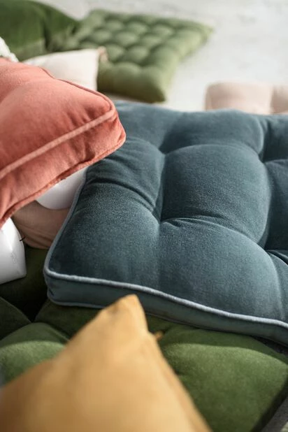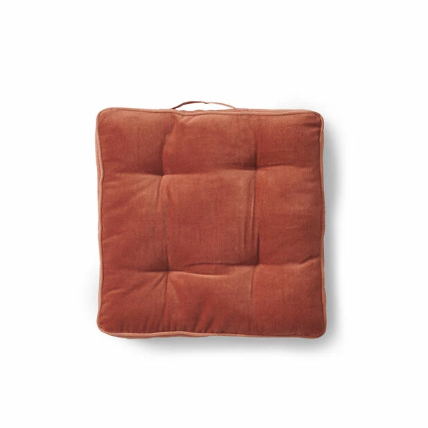 Komfortabel sittepute med bomullsvelur på begge sider og 100% polyesterfyll. Kommer med praktisk bærehåndtak på en side. Oekotex-merket. Mål: 40x40x7 cm.