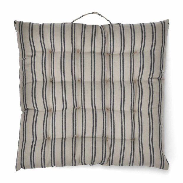 Klassisk beige sittepute med stilige blå striper. Bomulltrekk med håndtak på siden og 100% polyesterfyll. Oeko-tex-sertifisert, fri for helseskadelige kjemikalier og fargestoffer. For innendørsbruk.