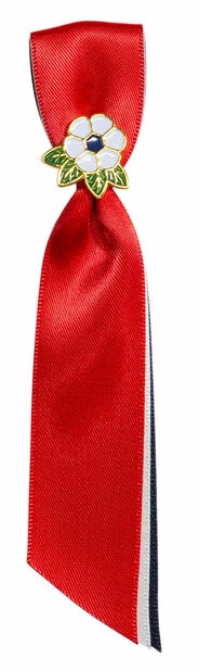 Klassisk 17.mai-sløyfe i flaggets farger; rødt, hvitt og blått pyntet med søt, hvit maiblomst. Lengde: 12 cm.