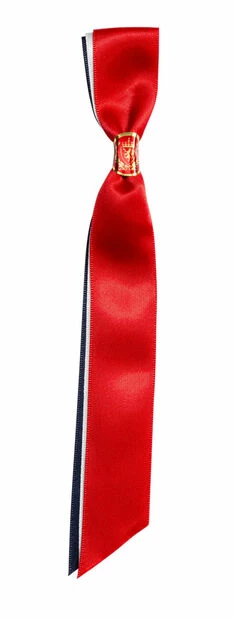 Klassisk 17.mai-sløyfe i flaggets farger; rødt, hvitt og blått pyntet med riksvåpenet. Lengde: 21 cm.