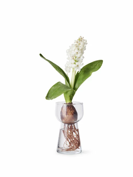 Vakker svibelvase i glass. Perfekt sammen med en velduftende svibel. Diameter: 8 cm, høyde: 14,2 cm. Fjern all jord fra løken og la kun røttene stå i vann.