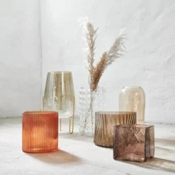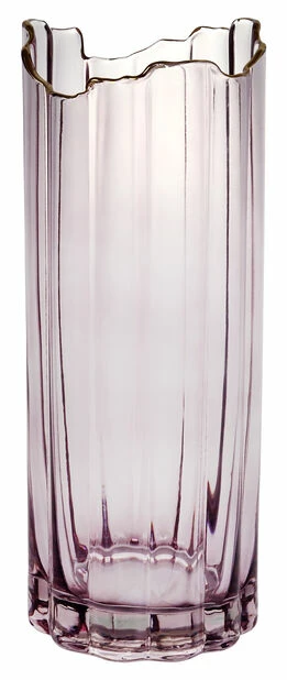 Moderne vase i transparent glass med en vakker rosa nyanse og unik, spennende design.