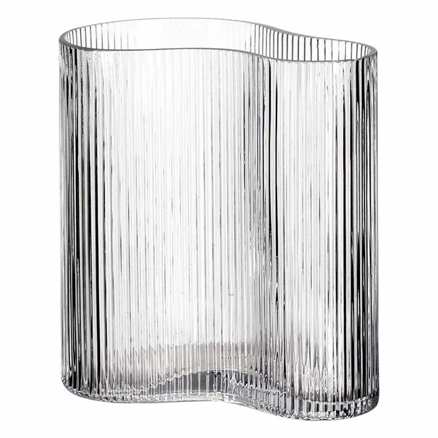 Vaser er perfekte detaljer å innrede med! Mange vaser er like fine i seg selv, plassert i bokhyllen eller på bordet som når de er fylt med vakre buketter, strå eller tørkede kvister. Med enkle grep som vaser kan atmosfæren i hjemmet og detaljer enkelt oppdateres helt etter sesong, humør eller anledning. Vasen Kerstin er en bred asymmetrisk vase i transparent glass. Designet er moderne hvor glasset har en spennende rillete tekstur. Vasens utforming passer til både moderne og mer tradisjonelle interiørstiler og er like vakker som den er, men blir selvfølgelig enda vakrere med blomster i! Den brede formen gjør den velegnet til løse buketter en større, enkeltblomster. Tulipaner er eksempel på blomster som er velegnet til denne vasen.