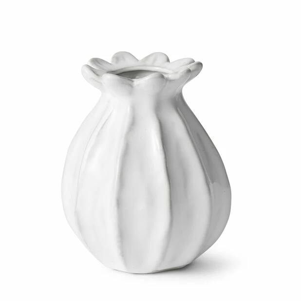 Fin hvitglasert keramikkvase formet som en valmuefrøkapsel. Håndlaget og vanntett. Høyde 11,5 cm, bredde 9,5 cm. Fås også i svart.